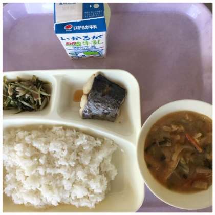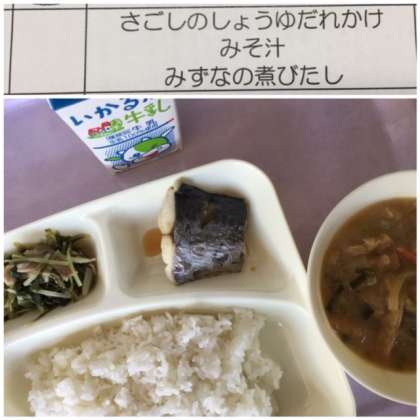 本日の献立は、さごしのしょうゆだれかけ、みそ汁、みずなの煮びたしです。