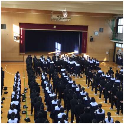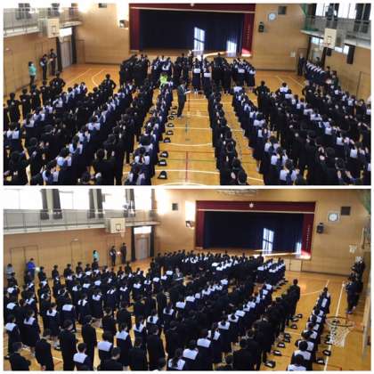 校長先生から「登校時のあいさつがよくできています。部活動でも実践していることが一つの要因だと思います。部活動は、ムダ、ムラ、無理のない取り組みが必要だと思っています。そして、自主的・自発的に取組むものです。大阪市ではプレーヤーズファーストという基本方針が出されていますが、本校でもそれに沿った取り組みを行います。部活で培った自主的・自発的な取り組みから、適切な判断ができ、責任あるおとなになることができると思う。」というお話を聞きました。さらに、インフルエンザが流行しているので体調管理に気を付けるようにということも話をされました。