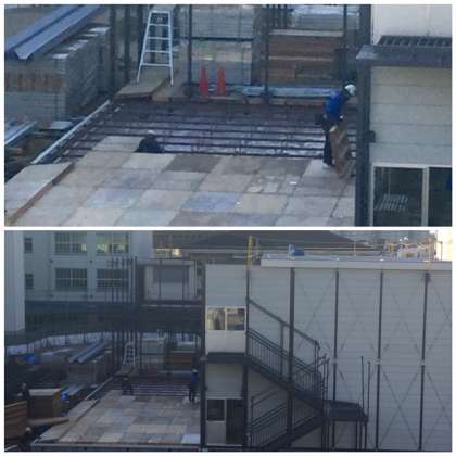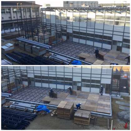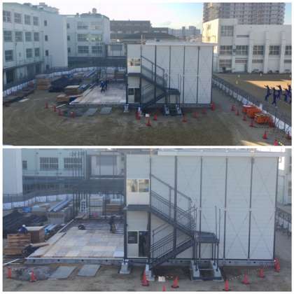 22日(火)の朝の様子です。南北に縦長の仮設校舎です。廊下を含めて西半分の校舎ができて、今朝は、東半分の校舎を建てているようです。