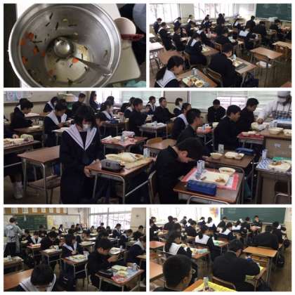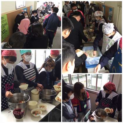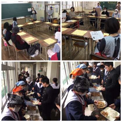 2年生の職場体験で留守にしている教室で、PTAの学校給食試食会が開かれました。配膳の様子をはじめ子どもたちの様子を見学していただきました。