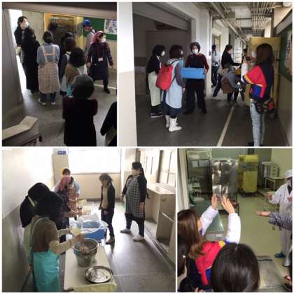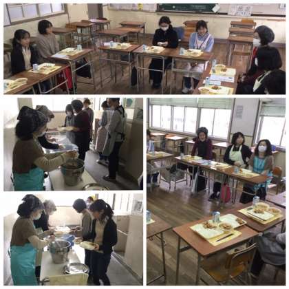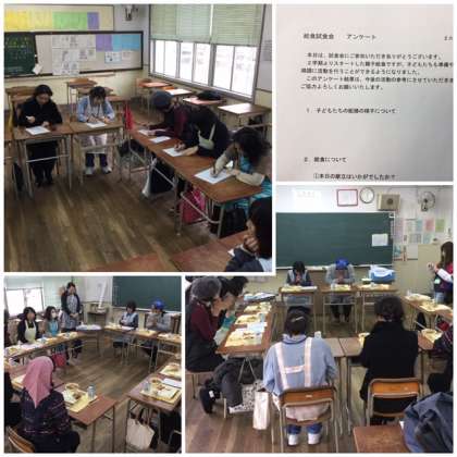 見学の後、実際に保護者のみなさんで配膳し、試食をされていました。みなさんは、給食がおいしいといって食事されていました。その後、アンケートの答えていただきました。