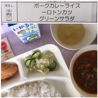 本日の献立は、ポークカレーライス、一口カツ、グリーンサラダ、洋なし(缶)です。明日は、3年生の私立高校の入試です。入試にカツ!