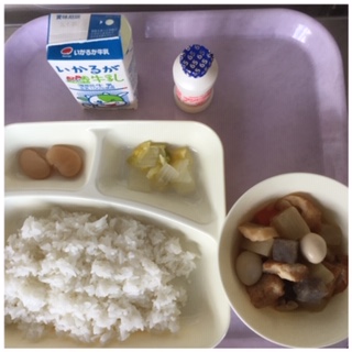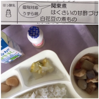 本日の献立は、関東煮、はくさいの甘酢づけ、白花豆の煮もの、はっ酵乳です。