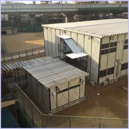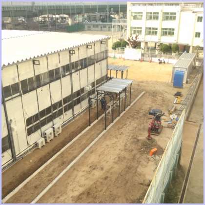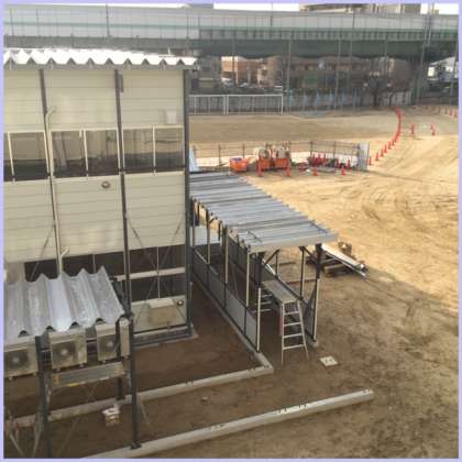 仮設校舎への渡廊下の屋根ができ始めました。校舎の南館から仮設校舎に入るための渡り廊下に屋根ができ始めました。