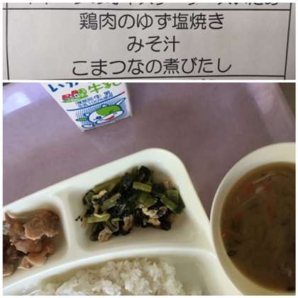 本日の献立は、鶏肉のゆず塩焼き、みそ汁、こまつなの煮びたしです。