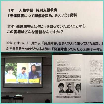 1年生は、28日5,6限にNHK番組「発達障害って何だろう スペシャル」を視聴し、各クラスで話し合いを行いました。昨年放送されたNHKの番組を使って、著名な3人が共通することがら、すなわち「自分ができないこと」「苦手なこと」を受け止めて、どうすればよいか考え、周りのサポートを得ながら、乗り越えていく様子を視聴しました。