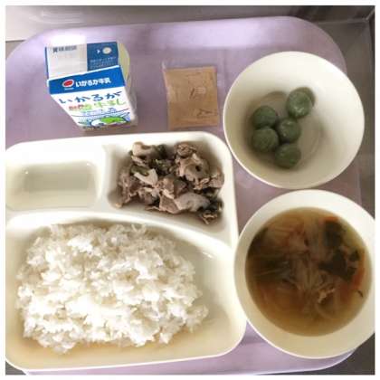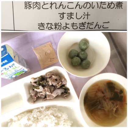 本日の献立は、豚肉とれんこんのいため煮、すまし汁、きな粉よもぎだんごです。