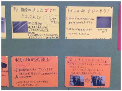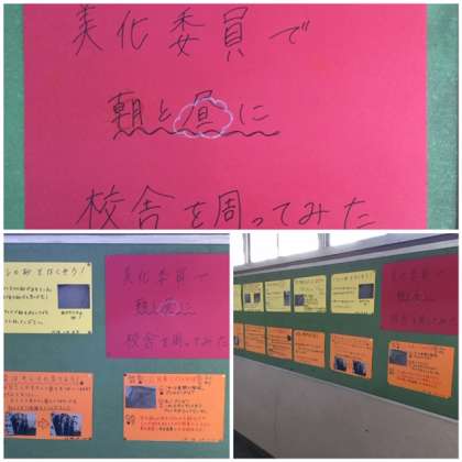 生徒会の美化委員会が、朝と昼に校舎の美化点検をしました。そこで気づいた点を、玄関廊下に掲示しました。
