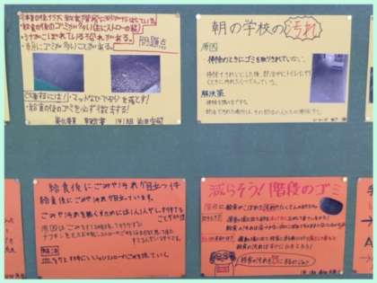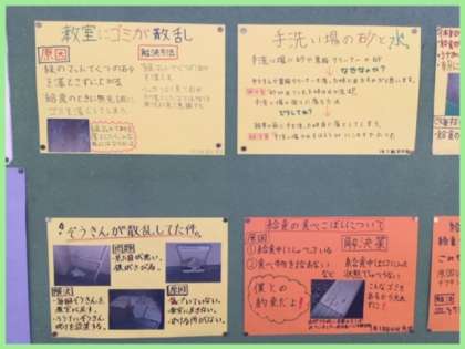 トイレに砂が上がっている状況や教室前廊下の傘立ての傘が整理されていなかったりゴミが目立つなどの点を指摘してくれています。解決策も掲示されていますので、よく読んで、みんなで美化活動に取組んでください。