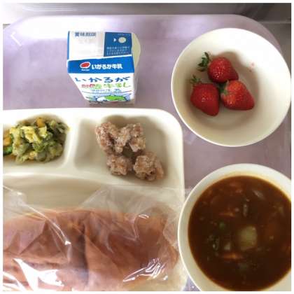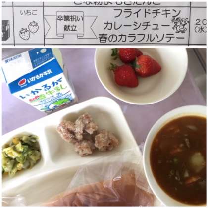 本日の献立は、卒業祝い献立として、フライドチキン、カレーシチュー、春のカラフルソテー、イチゴです。