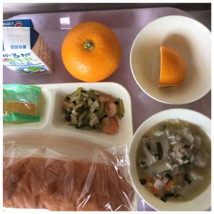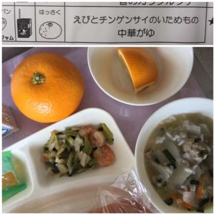 本日の献立は、えびとチンゲンサイのいためもの、中華がゆ、はっさくです。