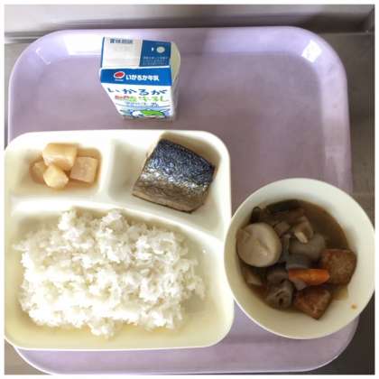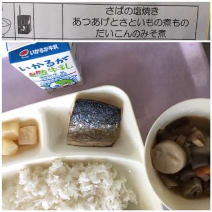 本日の献立は、さばの塩焼き、あつあげとさといもの煮もの、だいこんのみそ煮です。