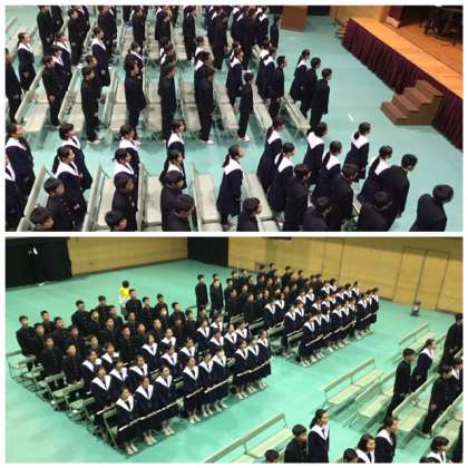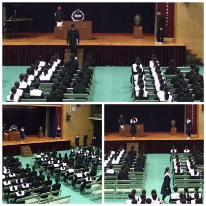 14日(木)の卒業証書授与式を控え、2・3年生が集合して、本番さながらの予行を行いました。3年生は、自分たちが主役であるという気持ちをしっかりと持ち、真剣に練習していました。