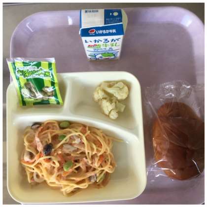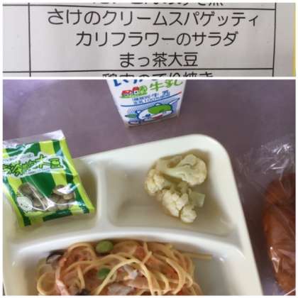 本日の献立は、さけのクリームスパゲッティ、カリフラワーのサラダ、まっ茶大豆です。