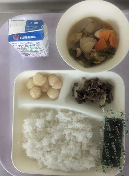 一口がんもとさといものみそ煮、牛肉と野菜のいためもの、みたらしだんご、焼きのり、ごはん、牛乳。