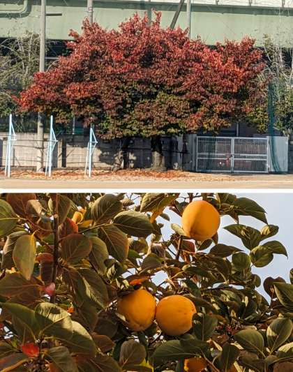 運動場西端の桜の木が紅葉しています。 校舎南側の柿の実も赤くなりました。
