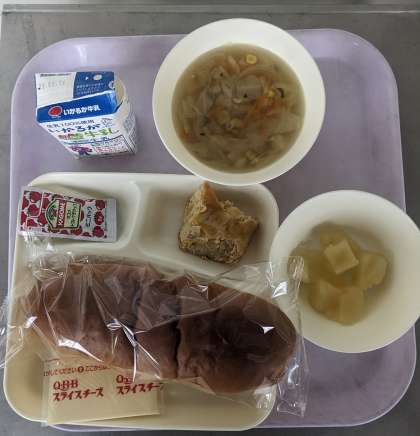 ツナポテトオムレツ、ケチャップ、スープ、洋なし、スライスチーズ、黒糖パン、牛乳