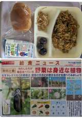 オイスターソース焼きそば、もやしの中華あえ、ぶどう(巨峰)、ミニコッペパン、牛乳...