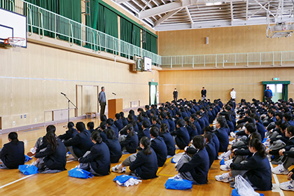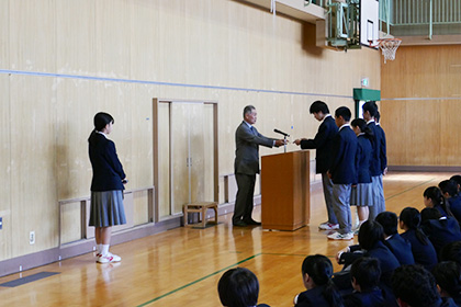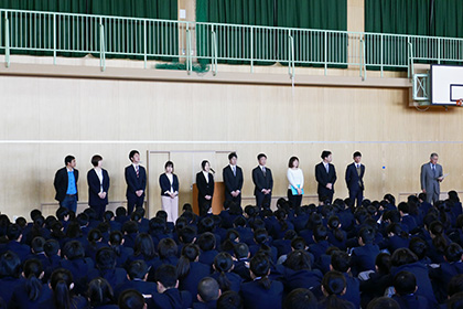 1年生を迎えての始業式が行われました。始業式のあとは新しく来られた先生方の紹介と、前期生徒会役員の認証式が行われました。
