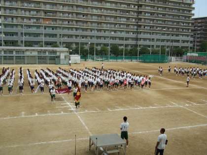 入場行進から、開・閉会式の流れを確認しました。行進は、吹奏楽部の演奏のもと、みんなが一つになって取り組んでいました。