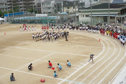 午後の競技は部活動対抗リレーからスタートしました。吹奏楽部の演奏と共に、部員たちが入場行進をしました。競技の結果1位は、女子の部がハンドボール部。男子の部が野球部となりました。