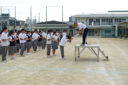 本日の全校集会で、体育大会新記録を出した人への表彰を行いました。