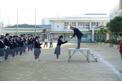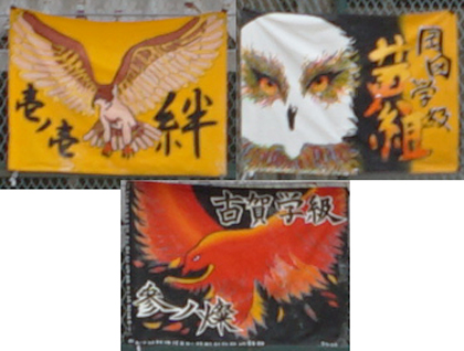 体育大会に向けて制作した学級旗。文化発表会でも展示を行い、学級旗コンテストとして投票も行いました。その結果発表と表彰を本日の全校集会で行いました。結果は1年1組、2年1組、3年3組となりました。