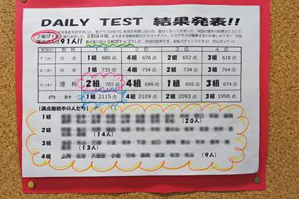 デイリーテスト3日目の教科は理科です。今回の理科の結果は2組がトップになりました。次は数学、頑張ってくださいね。