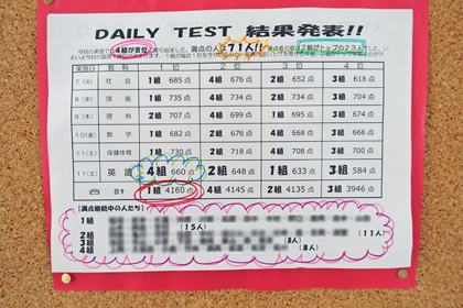 デイリーテスト6回目は英語。いよいよ国語を残すだけとなりました。英語は4組がトップとなり、接戦となりそうです。満点継続中の人たちは47人。最後も頑張ってくださいね。