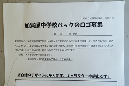 皆さんは現在のカバンを使いますので、新しいデザインのカバンを使う事はありませんが、今後、加賀屋中学校で、しばらく使われていく事になりますので、良いデザインを考えてください。デザイン締切は9月4日(金)です。
