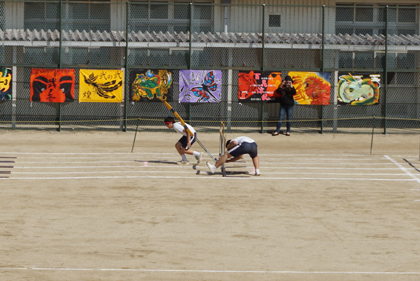 バラエティーリレーは、なわとび、ハードル、袋とび、網くぐりの4つに挑みながら走る競争です。