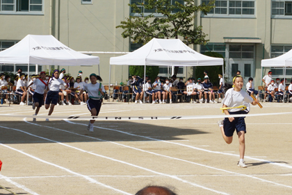 後半はリレー種目です。まずは女子100mリレー、トラック半周をリレーします。差が縮まると大いに盛り上がりました。