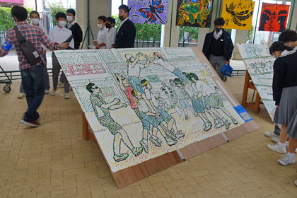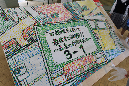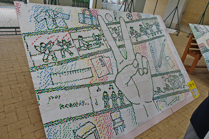 3年生の展示は「もざいくあーと」テーマは思い出です。3年間の思い出を1cm×1cmほどのチップを組み合わせて絵で表現しました。