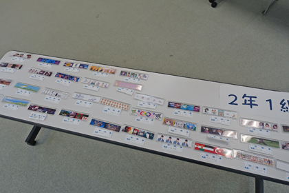 美術科では、「不思議な花」「てん刻はんこ」「オノマトペ物語」の展示をしました。画像はオノマトペ物語です。技術家庭科は「オリジナル定規」と「コースター」「食事を作ろうメニュー」「クロスステッチ」「折りたたみ絵本」「のびーる絵本」を展示しました。画像はオリジナル定規とクロスステッチです。