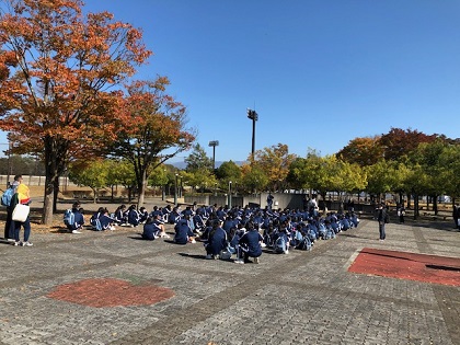 3年生は、長野県の飯田運動公園に到着。現在昼食をとっています。この後、ラフティング体験を行います。