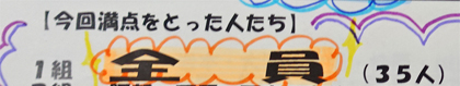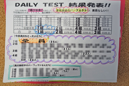 デイリーテスト5教科目は保健体育。みんな一生懸命勉強しています。そして、このテストでは凄い事が起こりました。なんと1組全員が満員獲得です!1組では歓声が起こりました。
