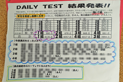 デイリーテストの取り組みも6教科目「数学」に突入。残すは「技術」となりました。1組がリードし、2組が追い上げます。現在の全教科パーフェクトは23人です。最後まで気を抜かずに頑張ってください。
