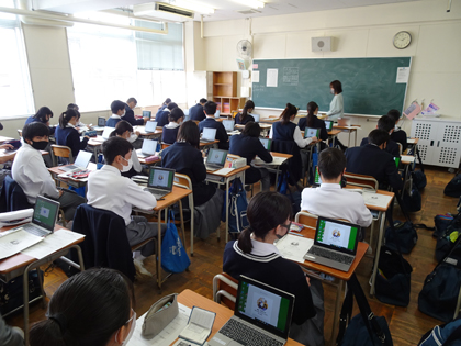 一人に一台のタブレット型学習端末が整備されましたが、その端末を活用して、扱い方の学習をしています。