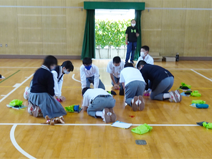 2年生の保健体育の授業で、心肺蘇生法の授業をしています。2グループに分かれ、メトロノームの音に合わせて胸骨圧迫をしたり、倒れている人に対して、周りの人と協力しながらAEDを扱ったりしました。