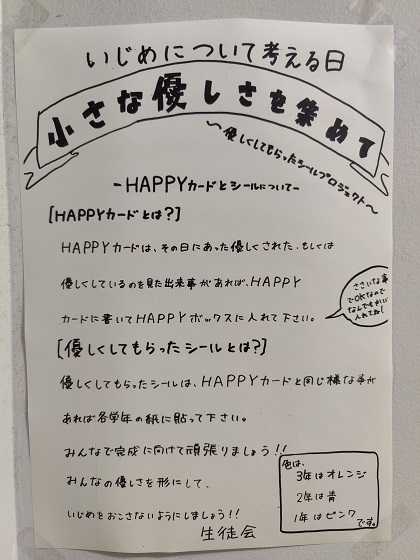 学年掲示場のところに、シートがあるので、貼って作品を完成させましょう。特に、素晴らしい事例があれば、HAPPYカードに記入してHAPPYボックスに入れて下さい。加賀屋中学校にあふれる優しさを目で見える形にして、いじめを抑止していきましょう。