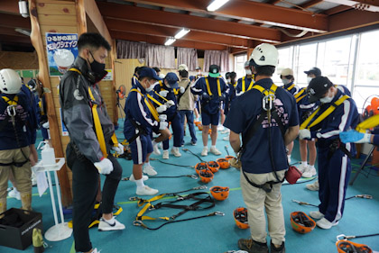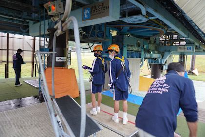 ジップライン、アルプスアドベンチャー、オルゴール作りの活動がスタートしました。(マウンテンバイクは天候の関係でジップライン、オルゴール作りに変更となりました)画像はジップラインの様子です。