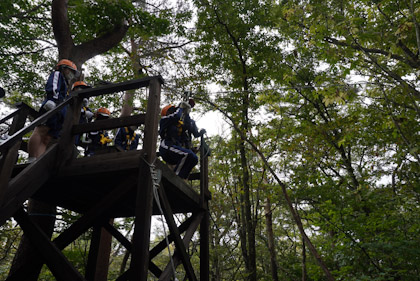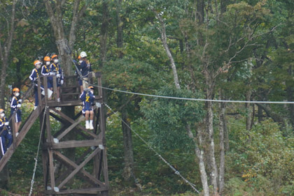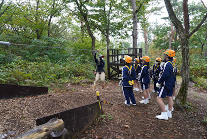 ジップラインの練習が終わり、本番のコースに出ました。ゴールの着地が難しいようです。みんな楽しそうに滑走していました。