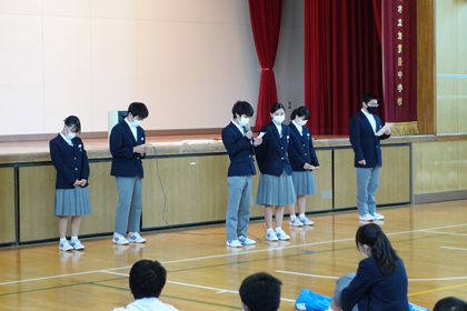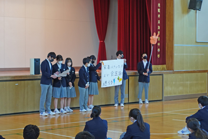 今日は各学年で冬休みに向けての学年集会を行いました。画像は、学級代表による2学期の反省と、保健委員会が健康管理の説明をしている様子です。