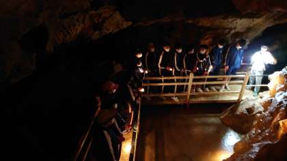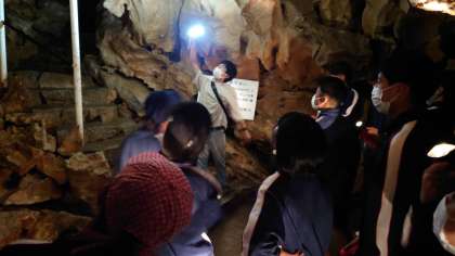 さらに、洞窟ものがたりグループです。ガイドさんに続いて暗くて狭い道?を歩いていきます。