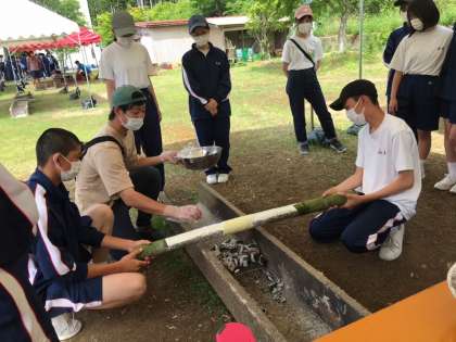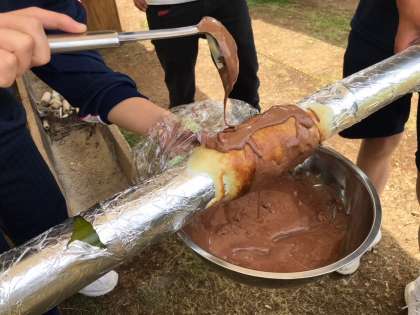 切り出した竹を使って、バウムクーヘンを作っていきます。