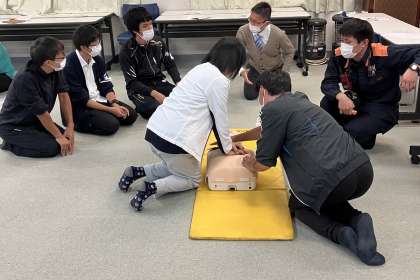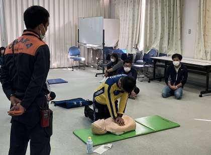 DVDで基礎を学び、実際に胸骨圧迫のやり方とAEDの使い方を勉強しました。