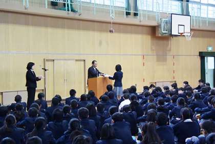 3学期が始まりました。3学期の授業は50日ほどしかありません。一日一日を大切に頑張ってください。写真は始業式での、表彰の様子です。