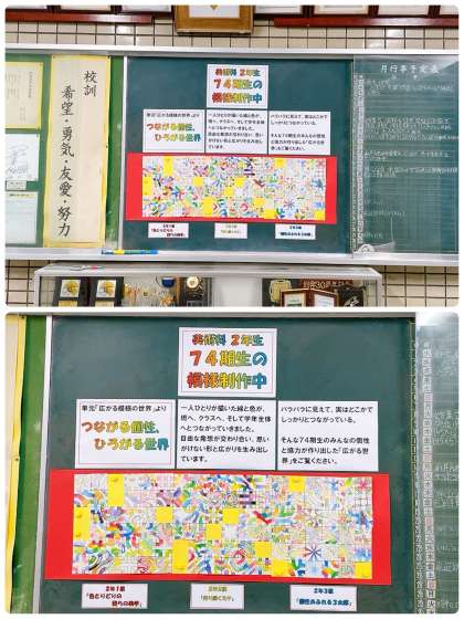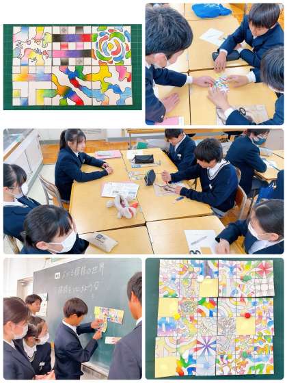 制作過程では、班ごとに作品を組み合わせる相談をしたり、クラス全体で模様を広げる工夫をしたりと、協力しながら進めました。