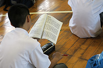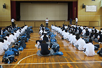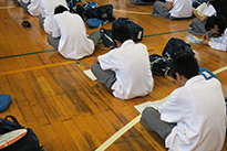 1年生は明日から一泊移住に行きます。今日は最終の打ち合わせとして、体育館でしおりを見ながら持ち物などの確認を行いました。