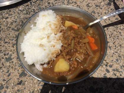 カレーが出来上がりました。みんなで協力して作り上げたカレーの味は、いつも食べているカレーとはひと味違うおいしさです。